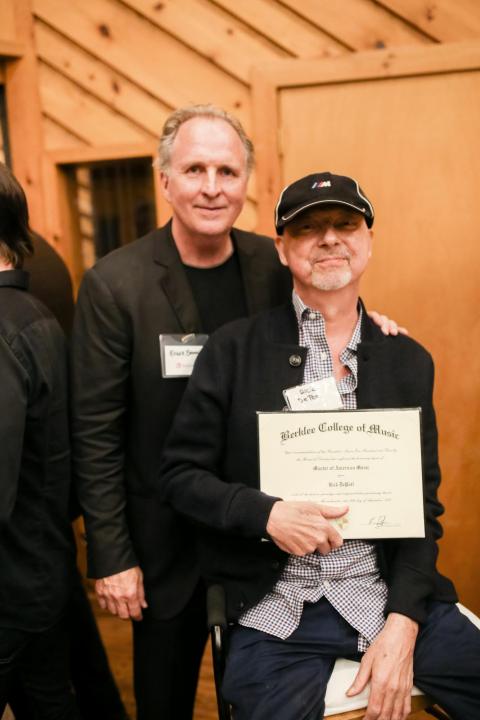 In his acceptance remarks, DePofi thanked Berklee and many of his musical partners over the years, including late jazz saxophonist and faculty member John LaPorta, saxophonist Jack Bashkow, and guitarist/producer John Leventhal. The latter he credited with teaching him about “doing the right thing and helping the right people. That was very fulfilling to me.” He also gave special thanks to Muller, “because that guy made this happen.”