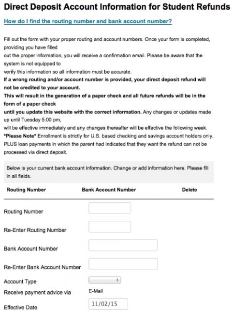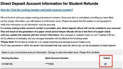 5. Once you have entered your information, you will see your routing number and the last four digits of your account at the top of the "Direct Deposit Account Information for Student Refunds" page going forward. If you need to change your direct deposit information, you must first delete whatever existing information is there.
