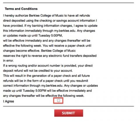 3. Enter your U.S. banking information on this form. Failure to enter your correct routing and checking account number will delay your receipt of your refund. Berklee does not validate whether or not your information is correct.