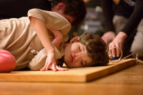 Hunched over on his knees, Colby rocked back and forth excitedly as he fingered the small keyboard with his left hand and held a transducer to his chin with his right. He couldn’t hear the notes, but he could undoubtedly feel them: Kim’s setup featured “bass shakers,” the low-frequency device that makes your movie-theater seat feel like it’s rumbling during the action scenes. Kids at the previous session were lying on the resonance board to feel the vibrations of the music with their whole bodies, said Kim.