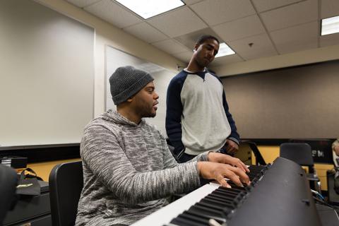 Ensemble faculty Alonzo Harris (at keyboard) and Chantel Hampton work with City Music students.