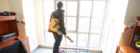 Level 4 is considered part of the residence hall. Except for the three rehearsal rooms, access is limited to resident students. A registered guest accompanied by a resident student can use the rehearsal rooms. The fitness room, open 24 hours a day during the semester, is available to resident students only.