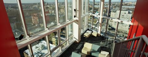 - Six double-height lounges on residence hall floors, each of which serves two residence hall floors, with dramatic views of the Boston and Cambridge skylines. These are amazing spaces for hall/floor programs and events.