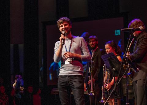 Michael League, bandleader of Snarky Puppy, leads Berklee City Music Network master class students in the finale band at the summit.