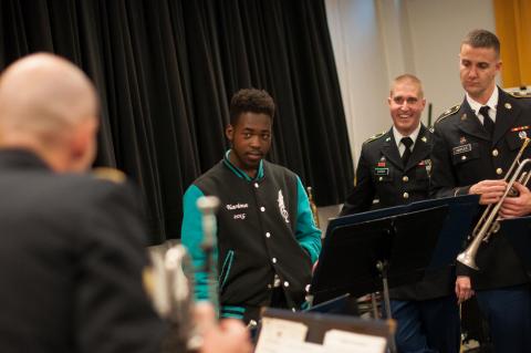 Students participate in a clinic with members of the 99th Jazz Orchestra of the U.S. Army Reserve as part of the City Music Student Summit.