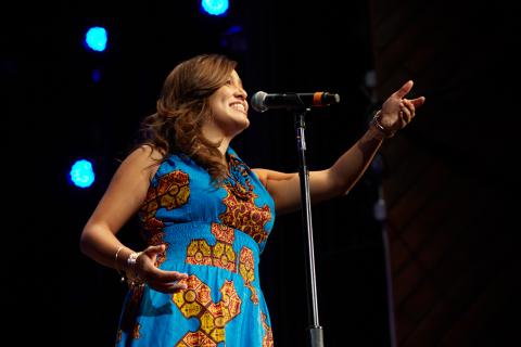 Vocalist Maria Alejandra Jimenéz, a Berklee student from Colombia, performs on stage. The concert displayed the traditions and styles of Colombia both through music and wardrobe.