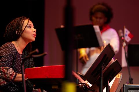 Keyboardist Zahili Gonzalez, a Berklee student from Cuba, performs as part of the concert’s rhythm section.