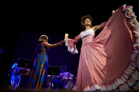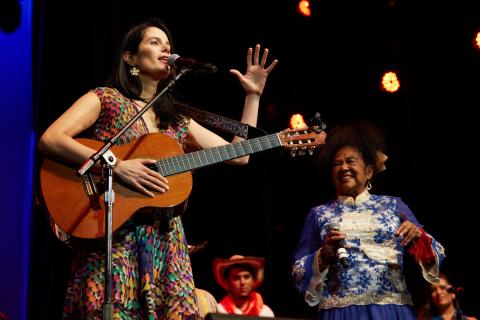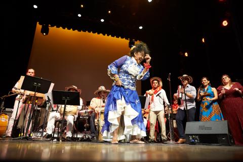 As part of Berklee's Signature Series, the Berklee Performance Center welcomed singer and visiting artist Totó la Momposina on November 5 for a special performance celebrating the music and traditions of Colombia. Backed by a student orchestra with horns and a rhythm section using traditional percussion, the first half of the performance featured student vocalists and arrangers, while the second half centered on a commanding performance by Totó la Momposina herself, featuring dancers from the Colombian Youth Folklore Ballet Bajucol. The band for the sensational performance included vocalist and Berklee alumna Mónica Giraldo ‘02, percussionist Marco Vinicio Oyaga, and bassist and student musical coordinator Esther Rojas.