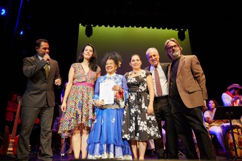 Totó la Momposina receives an award from the Massachusetts House of Representatives recognizing her representation of Colombian culture through music and arts.