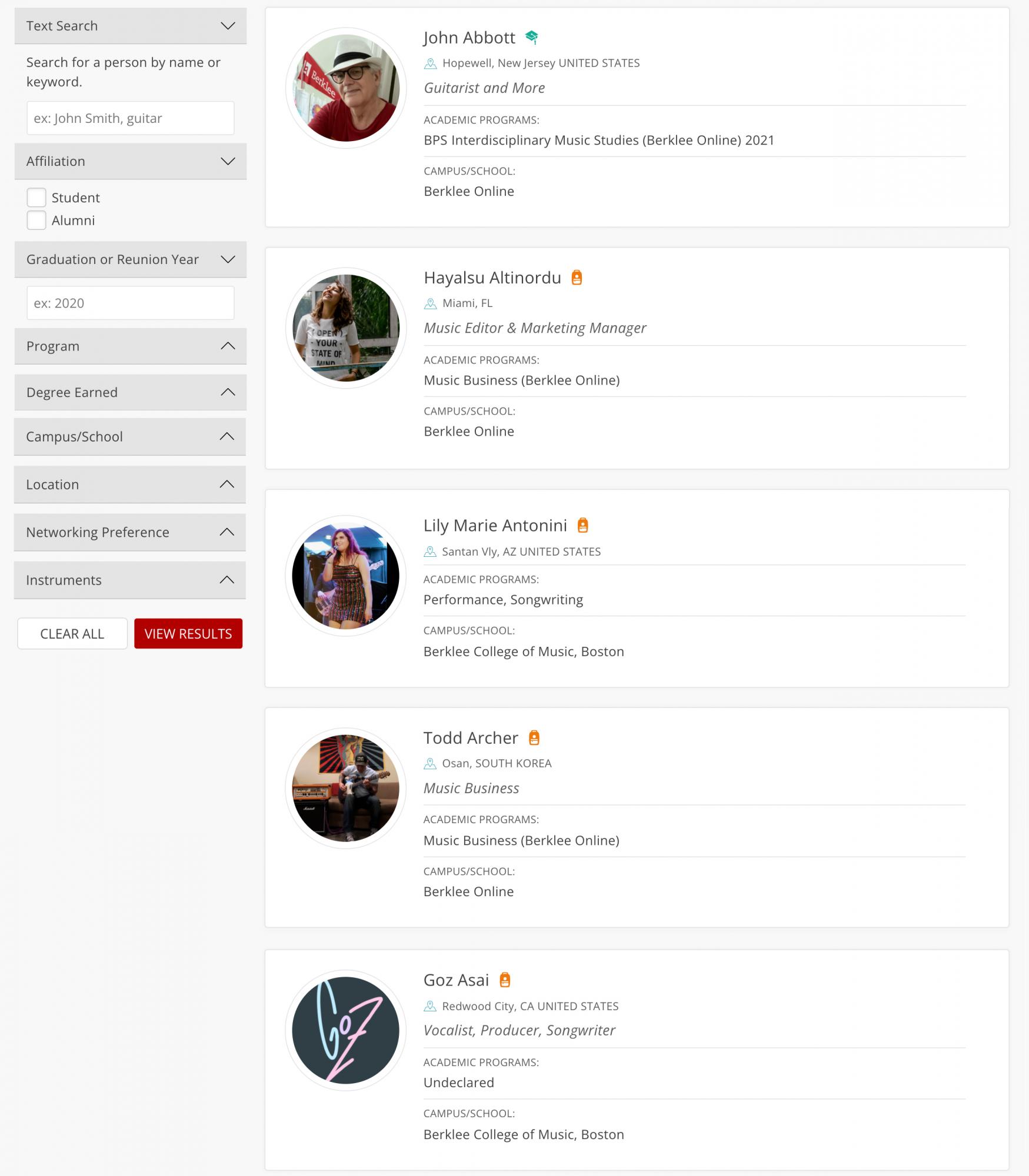 Berklee Connect (login required) is our student/alumni directory. It includes a profile for anyone who is studying or studied at Berklee. Check out your profile (login required) in Berklee Connect, and add more information to help others in the Berklee community find you.